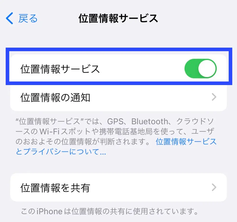 3.「位置情報サービス」が「オン」になっているか確認してください。なっていない場合は変更してください。